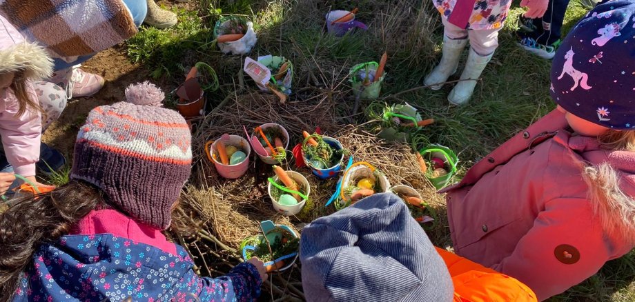 Auf dem Weg dorthin wurde mit viel Spaß das Lied vom „Stups der kleine Osterhase“ geschmettert, bevor die Suche richtig losging.
