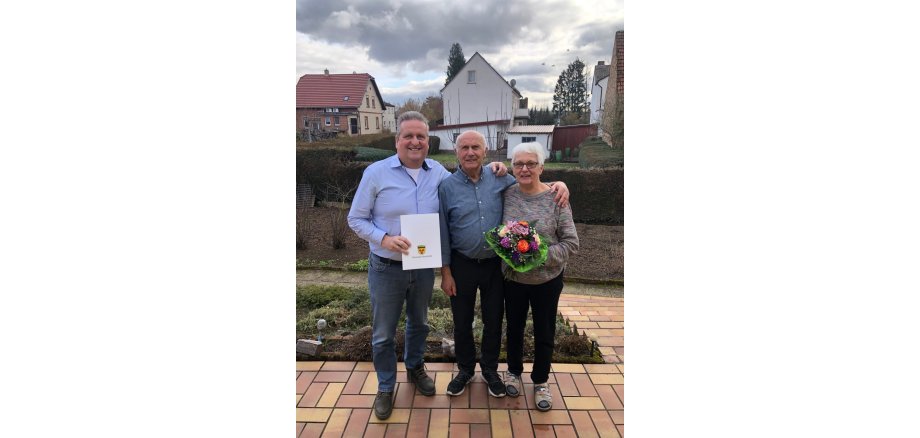 Auf dem Foto: Jubilar Karl-Heinz Müller mit seiner Frau Thekla und Bürgermeister Matthias Pfeifer