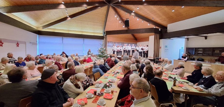 Nach einem ersten gemeinsamen Singen begrüßte dann die Seniorenbeauftragte Beatrice Astrid Hechler die Seniorinnen und Senioren aufs Herzlichste in der schön geschmückten Halle. Sie hatte einen kleinen Impuls dabei und ließ einen Stern für alle erleuchten. Des Weiteren dankte Sie, wie vorher auch schon Bürgermeister Matthias Pfeifer, dem Gemischten Chor für die Vorbereitung und Durchführung und den Maltesern für den Fahrdienst an diesem Nachmittag, so dass auch alle, die in die Halle wollten, dorthin kamen. Ohne alle Helferinnen und Helfer wäre es nicht möglich, einen so schönen Nachmittag für alle Seniorinnen und Senioren durchzuführen.